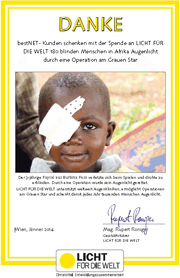 Dank dem Engagement unserer Kunden bei der bestNET.Weihnachtsaktion konnten wir € 5.400,oo an Licht für die Welt überweisen. Damit können 180 Operationen am Grauen Star in den ärmsten Ländern der Welt finanziert werden.